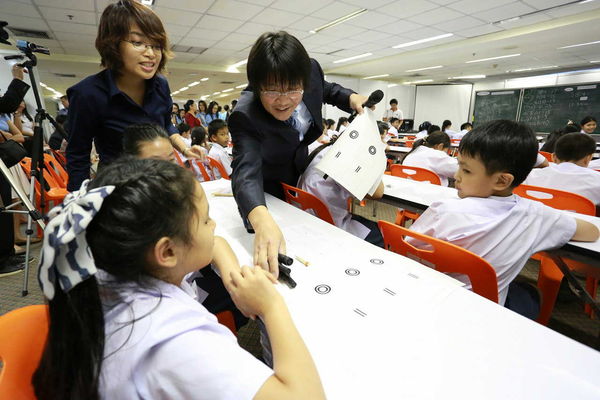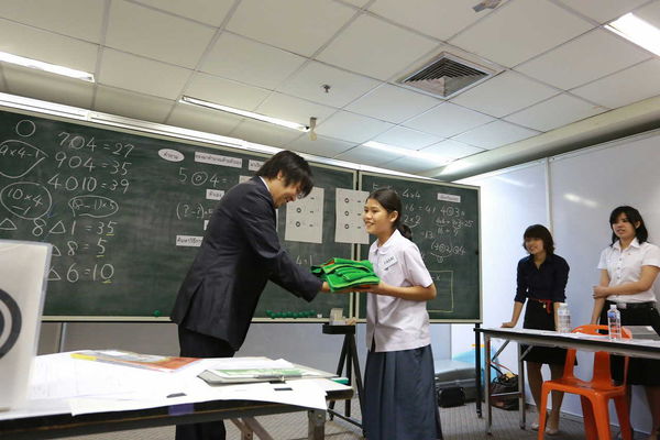 英宏小学校の3年生が公開授業のときに楽しんだ「のぶちゃんボックス」を使った授業です。 +、-、×、÷のボックスに、2つの数を入力して、演算してカードが出てくるという、ブラックボックスです。 四則演算を確認したあとは、中学受験でも出題率の高い「約束記号」にかわります。「○ 4○5=19」「□ 8□6=10」さあ、どんな計算の意味があるのかお考えください。 そして、「◎」の計算の約束を自分で考えるというオープンエンドの学習を進めます。このなかで花まる先生がとりあげたのは、「4◎5=41」という考え。子どもだけでなく、参観者の皆さんも頭をひねってしまいました。 「4×4+5×5」というアイディアでした。タイの子どもたちの発想や思考力の高さに驚かされました。2乗になるということを伝え,「この考えでやりたい!!」という声がたくさんあり、実際に追体験させることで平方の概念も高めました。 教材とともに、花まる先生の書籍「チェックリストですぐにできる新算数科の授業づくりスタンダード」で紹介されている、板書や問題解決授業の学習過程も研究協議で大絶賛の授業となりました。