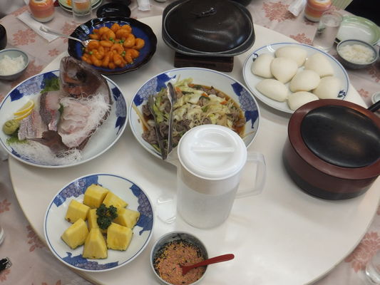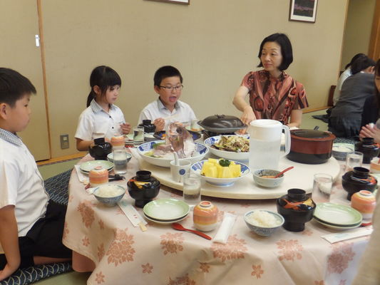 晩ご飯は長崎の郷土の味も楽しみます。校長先生はじめ小中学校の引率の先生方と小中学生みんなでおいしいひとときを過ごしました。
