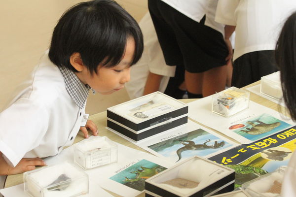 英宏小に「恐竜」がやってきました!茨城県立自然博物館のご協力をいただき、今週は化石標本および化石レプリカを児童ホールに展示しています。普段は見ることのできない貴重な化石の数々に子どもたちも大喜び。アロサウルスやプロトケラトプス、始祖鳥やアンモナイトなど図鑑で名前は知っていても、実物は初めての子どもたち。隣接した図鑑コーナーも大人気で子どもたちは図鑑を見ながら、化石に見入っています。EIKO化石ミュージアムは今週いっぱい児童ホールで開催しています。