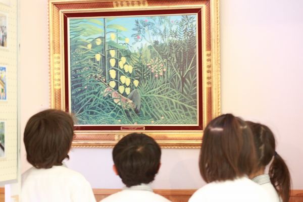 「夏」はルソーの「熱帯林」。トロピカルでちょっと不思議な雰囲気の絵に子どもたちは見入っています。この2枚の絵画は今学期いっぱい、児童ホールに展示するとともに、国語や図工の授業で活用します。※2枚の複製画はともに茨城県近代美術館のご協力います。