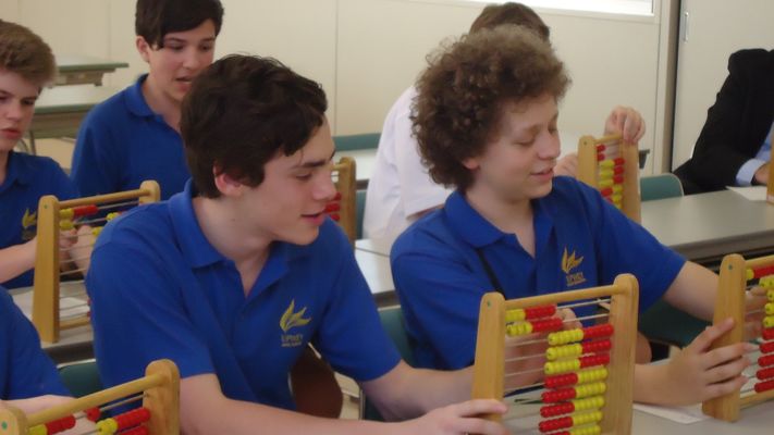 算数体験では百玉そろばんを使った1から100までの「数の数え方」のほか、億の位までの数の数え方をはなまる先生から楽しく学びました。