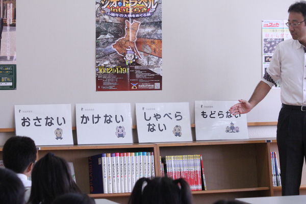 避難訓練の後は、警察のお二人による防犯講話です。万一、不審者に遭遇した時にどのように対応するか。そして、犯罪被害を防止するために日頃からどんなことに気を付ければよいかわかりやすく説明していただきました。