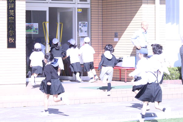 今日は今年度2回目の避難訓練。水戸警察署生活安全課の方とスクールサポーターのお二人をお招きして、不審者対応の避難訓練を実施しました。今回の避難訓練はグラウンドに児童がいる時に、不審者が侵入したことを想定して実施しました。