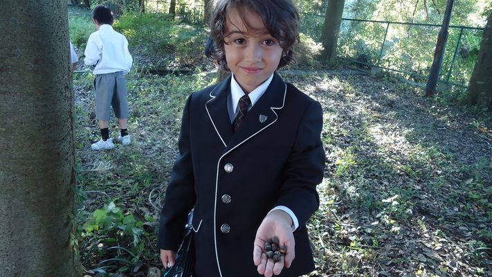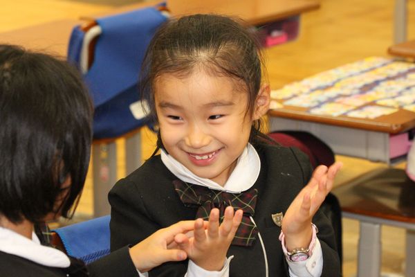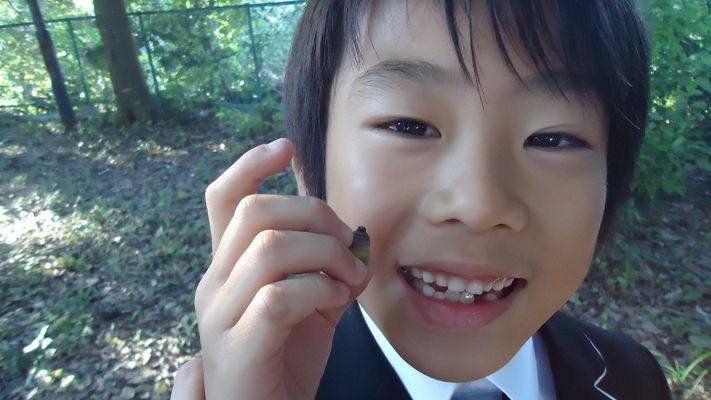 1年生の国語教室は「創作教室」。自然が豊かな学校敷地内を散策して「俳句」を作ります。子どもたちは秋の「風」「光」「影」「におい」「草花」などを五感を使って感じ取り、俳句で表現します。子どもたちは「創作教室」を通して、様々な言葉を身につけていきます。赤く熟した烏瓜。香り立つ金木犀。咲き誇る秋桜。たわわに実った団栗。子どもたちは体感したことを俳句を通して表現することによって、言葉を実感していきます。英宏小では高い学力を育成するとともに豊かな感性も育んでいきます。