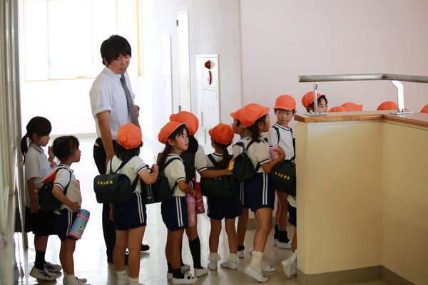 校内見学では,音楽室・理科室・家庭科室・図画工作室など小学校の様々な教室を興味深く見入っていました。また、1年生・2年生の授業見学をしました。