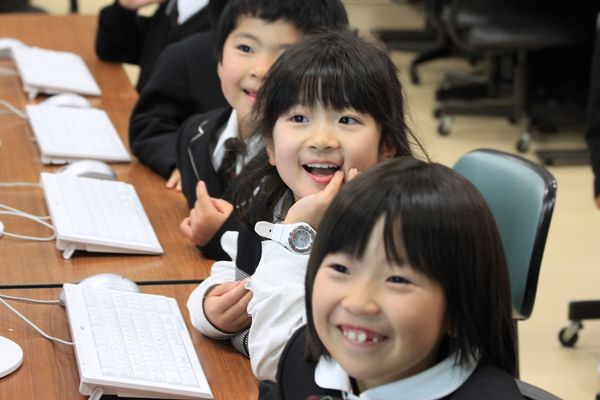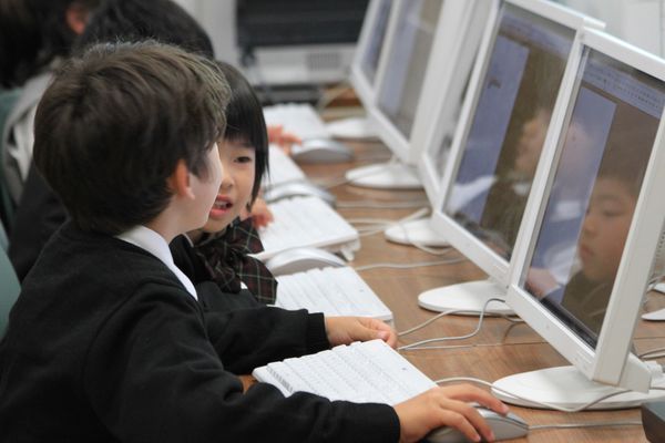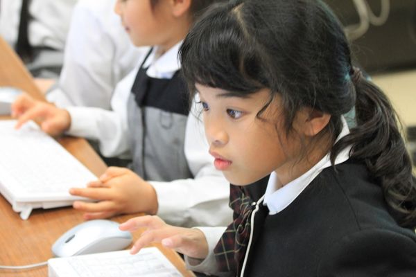 英宏小学校では1年生の時からコンピューターに親しむ機会を多く設定しています。今日はアフタースクールのコンピューター教室。ローマ字入力を練習しながら、アルファベットの習得へのステップアップを図っています。子どもたちも真剣なまなざしで入力練習をしています。