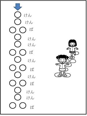 けんけんぱあそびをします。「けん」は,右足だけついてとびます。「ぱ」は,りょうあしでつきます。向こうからこのあそびをはじめます。左足をついたのはどこでしょう。左足をついたところの○を鉛筆でぬりつぶしましょう。