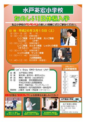 平成27年度以降入学者対象(新年長さん・年中さん・年少さん)の「たのしい1日体験入学」を3月15日(土)に開催いたします。体験授業は国語(ことば・そうさく)・算数(かず・かたち)・英語教室・社会科教室・実験教室・サッカー教室を開講し,短歌名人先生や花まる先生など日本を代表する教員をはじめ,オールEIKOスタッフによるワンランク上の30分3コマの授業を体験できます。 授業体験のほか、ランチプレート・教材・ランチプレート・制服の展示コーナーを設置して,本校の教育活動についての学校説明会を実施して,英宏小学校のスクールライフを楽しんでいただけるイベントとなります。また、平成25年度の入学試験問題の解説も実施いたしますので,本校入学をご検討の方は是非ご参加ください。お申し込みは,お電話,FAX,E-mail,ホームページの説明会申込フォームからお願いします。TEL 029-243-7804Email info@mito-eiko-es.ed.jp※1日体験入学は毎回参加者が多いため,定員のある授業は先着順にて締め切らせていただきます。※当日参加も可能です。当日参加の方は,ご希望の授業に参加できない場合がございますので,ご了承ください。