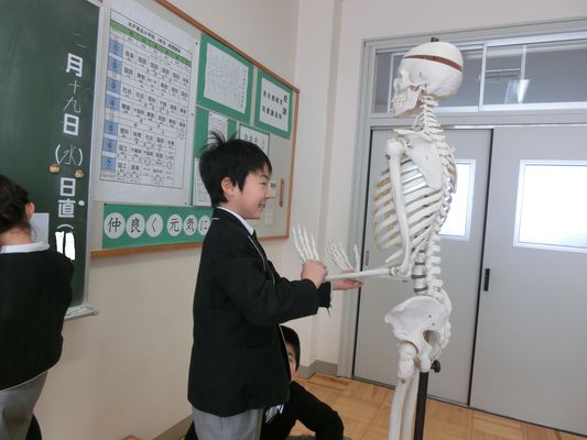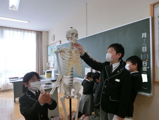 今日の3年生の理科は「人のからだ」の学習です。人体の骨格標本を使って,骨のはたらきや筋肉のはたらきについて学びました。人のからだの中には大小さまざまな骨が200個くらいあって,からだを支えたり,体内のものを守っています。今日の授業では骨格標本を実際に触って動かしてみたり,スケッチをとったりしました。