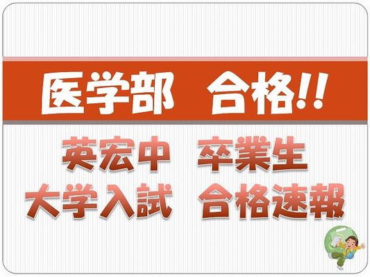 水戸英宏中学校卒業生大学入試合格速報(2014年3月11日現在 )東京大学(理科I類)現役合格!京都大学(総合人間学部)現役合格!香川大学(医学部医学科)合格!杏林大学(医学部医学科)合格!国立大 ・・・ 東京大、京都大、東北大、北海道大、東京工業大、筑波大、東京農工大ほか多数 私立大 ・・・ 慶應義塾大、早稲田大、上智大、明治大、立教大、青山学院大、東京理科大ほか多数