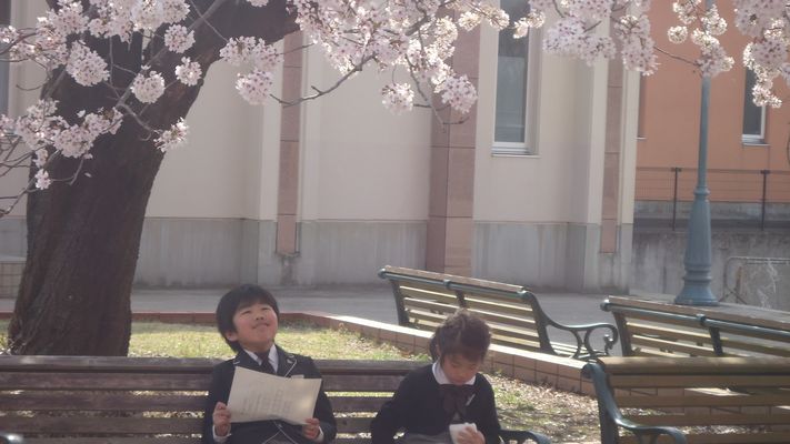 子どもたちは習った歌を声に出して読んで詩歌の世界を味わいます。そして、桜の花を見ながら創作を楽しみます。