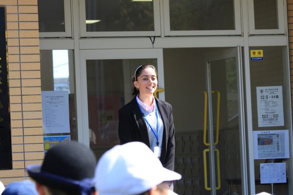 朝の「English Meeting」はナターシャ先生の笑顔のスピーチでスタート。この後、みんなで「Radio Exercise」です。
