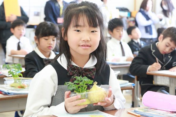 2年生は、たかこ先生のオリジナル教材の野菜を育てようです。野菜の切り株から、芽を育てるという内容で、観察やわかったことの発表などをしました。