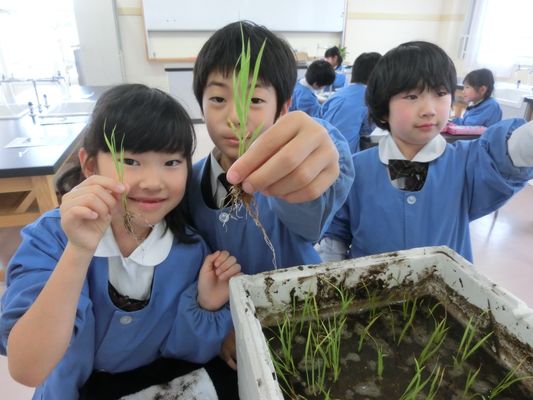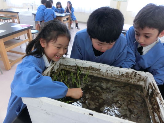 英宏小では1・2年生の生活科を「社会科分野」と「理科分野」に分けて、専門性の高い授業を進めています。今日の2年生の生活科は「田植え」。公立小では5年生の学習範囲ですが、早期先取り学習として取り組んでいます。