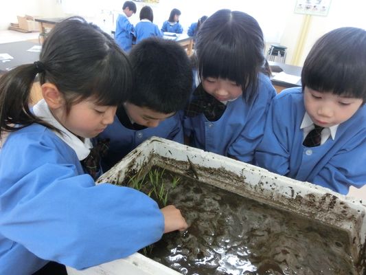 「イネ」の成長を観察するとともに日本の食文化として大切な「米作り」。初めて「田植え」をする子どもたちはドキドキしながら大事に「イネ」を植えました。