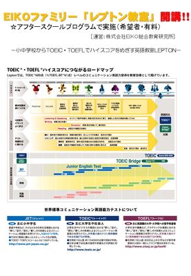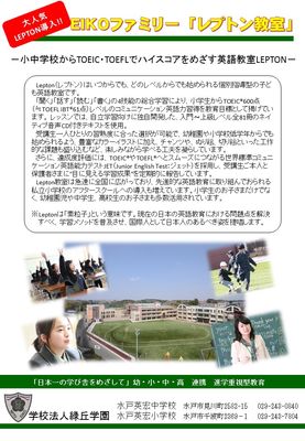 今回,本校では「小中学校からTOEIC・TOEFLでハイスコアを目指す英語教室LEPTON」をアフタースクールに導入し,英語学習のさらなる強化を図ります。水戸英宏小・中学校では小中一貫連携教育を推進し,これからの時代をリードする人材を育成していきます。