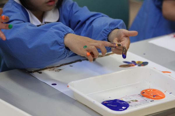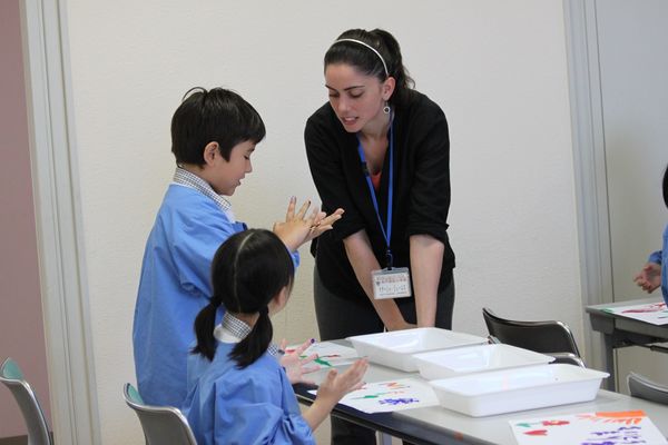 今日のアフタースクールはナターシャ先生の「英語でアート教室」。今回は「finger paints」です。