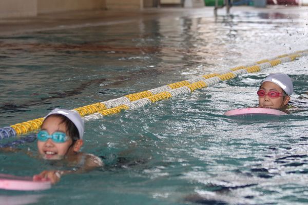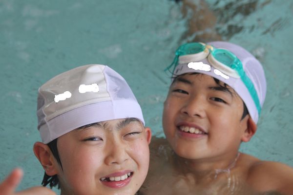 英宏小の水泳教室は市内のスイミングスクールと提携し、プロのインストラクターの指導のもと進めています。1クラスの指導者は3人。それぞれの泳力にあわせてプログラムが組まれています。