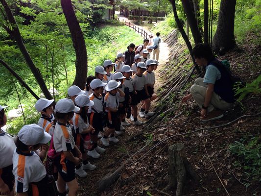 森の教室 で、インストラクターの先生に動物や植物などについて教えていただいています。