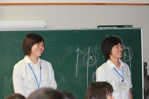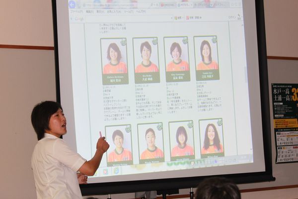 また、同じ日に予定されているMITO EIKO FC 茨城レディースのサッカー応援に向けて、現役女子サッカー選手のまい先生・りか先生からサッカーのゲームについて説明がありました。今回、ケーズデンキスタジアムでおこなわれる「皇后杯全日本女子サッカー選手権茨城県大会決勝戦」は水戸英宏小・中学校児童・生徒・保護者で応援します。説明のあとにはまい先生・りか先生にむけて全校児童でエールを送りました。