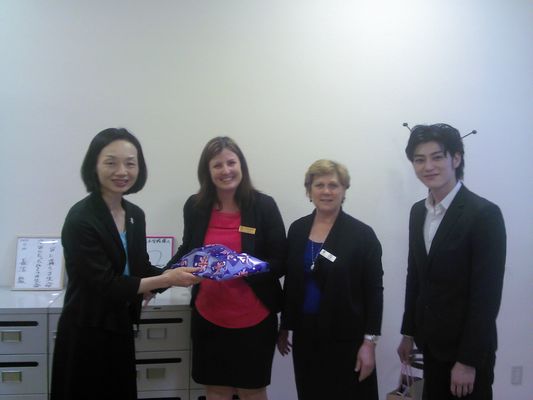 今回、水戸英宏小学校にホームステイしたのはオーストラリアビクトリア州の「Ferny Creek Primary School 」「Upper Ferntree Gully Primary School」「Belgrave South Primary School」の3つの小学校です。来日したUpper Ferntree Gully Primary SchoolのPeta校長とBelgrave South Primary SchoolのKerryn校長から本校の田中久美子校長に学校間の友好の証として子どもにさまざまなプレゼントが手渡されました。