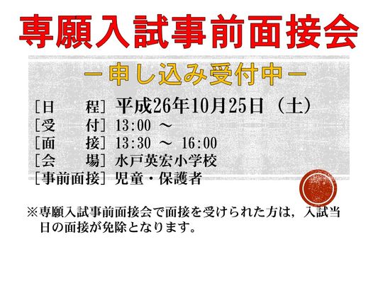 当日は,11月3日(月)の第1回入学試験の専願入学試験希望者の事前面接を行います。