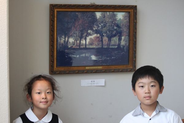 英宏小では子どもたちの感性を育てる教育の一環として「アート」に触れる機会を多く設けています。今月の児童ホールの名画はフランス絵画。ルソーやコローの名画を飾っています。