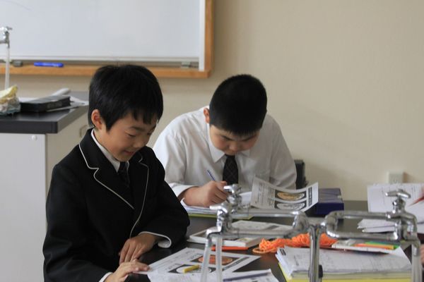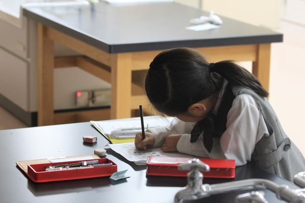 あらかじめ配付された観測用紙に記入する子どもたち。