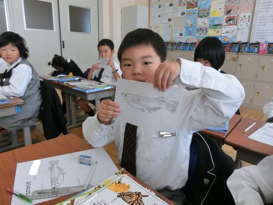 今日の1年生の理科遊びは「メダカの写し絵」。メダカの姿を楽しく学びました。