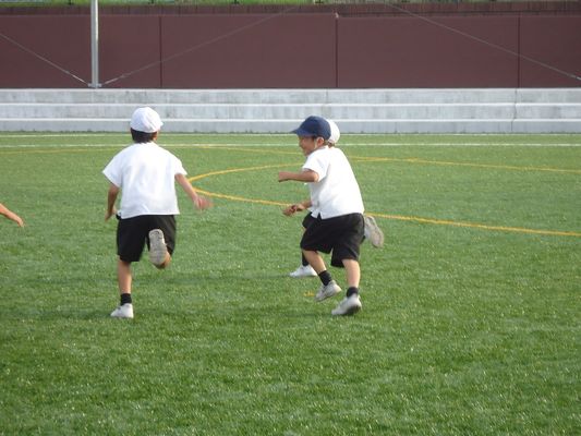 夕方になり、少し涼しくなった頃から、グラウンド遊びが始まります。おにごっこ、サッカー、ドッチボール…。元気に体を動かして、心地よい汗を流します。