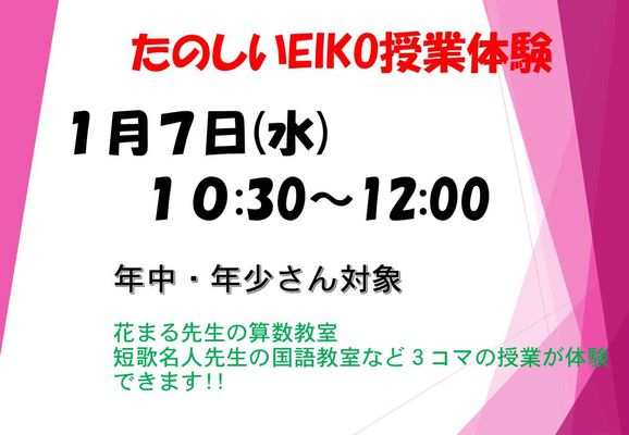 1月7日(水)は「たのしいEIKO授業体験」を開催いたします。対象は年中・年少さんのお子さまが対象となります。当日は花まるせんせいの算数教室や短歌名人先生の国語教室など3コマの授業体験ができます。※定員に達したため受付を終了しました。
