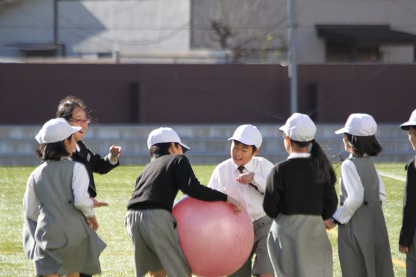 寒風の中、グラウンドで遊ぶ子どもたち。サッカー・ソフトバレーボール・バランスボール・なわとび・鬼ごっこ・棒のぼりなどが人気のグラウンド遊びです。
