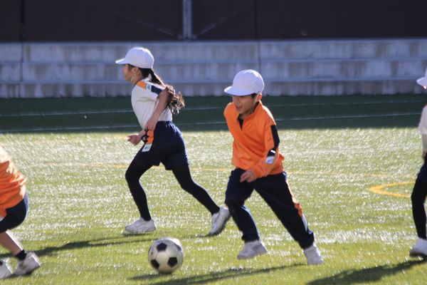 今日の6時間目は2・3年生の合同体育。サッカーで体を動かしました。