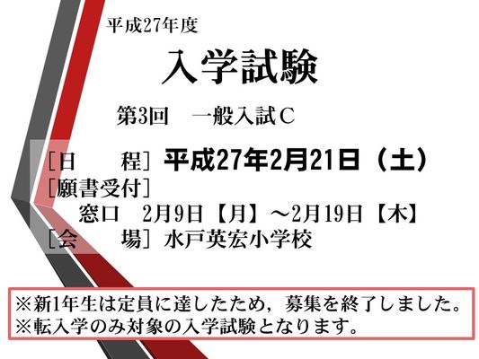 入学試験を受験される方は,以下のように願書を受け付けますので,必要書類の提出をお願いいたします。※新1年生は定員に達したため、募集を終了しました。