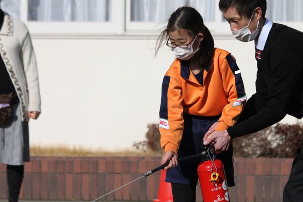 午後は火災訓練を実施しました。校内の家庭科室で火災が発生したという想定で避難訓練・消火訓練を実施しました。