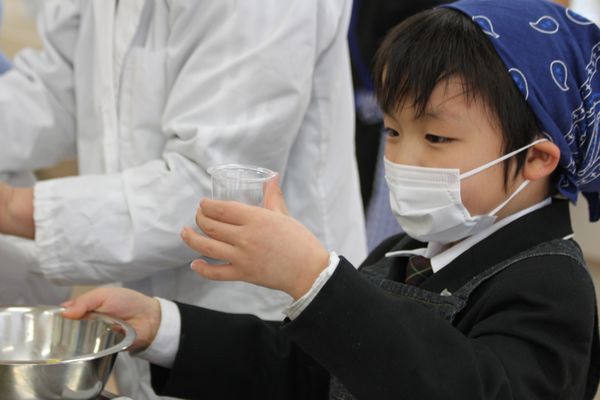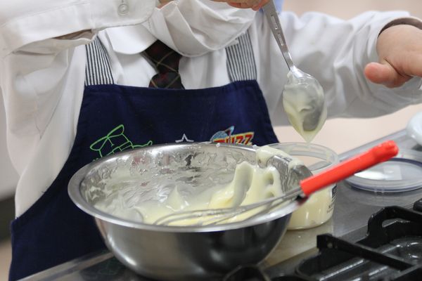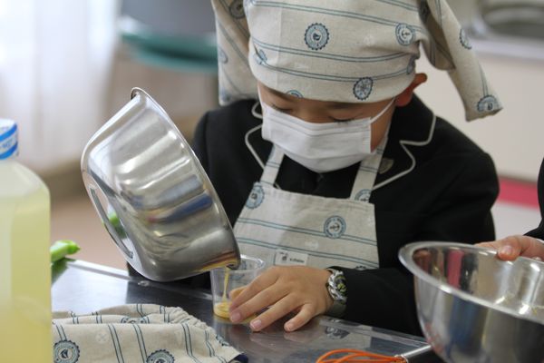 たかこ先生の指導のもと、「卵」や「サラダ油」など身近なものを使って、「マヨネーズ」を作ります。