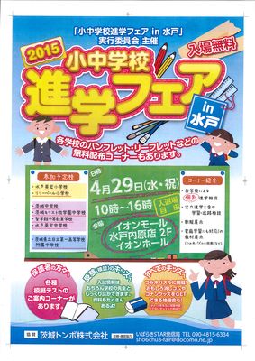 4月29日(水)にイオンモール水戸内原店2Fイオンホールにて「小中学校進学フェア2015 in 水戸」が開催されます。昨年大人気だった同進学フェア。当日は本校教員との個別相談のほか「はなまる先生」のミニ体験授業なども実施いたします。そのほか児童作品や本校教材等も展示いたします。たくさんの皆様のご来場をお待ちしております。