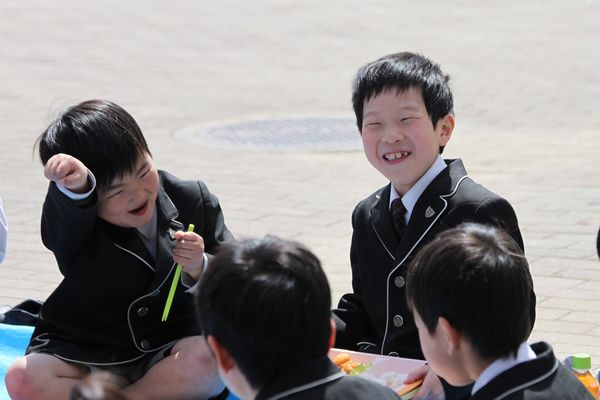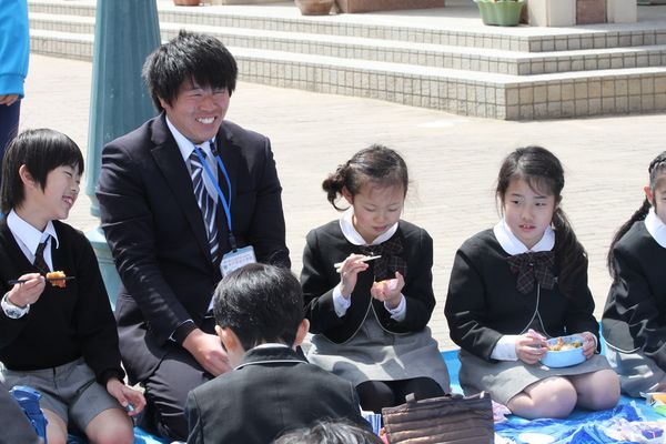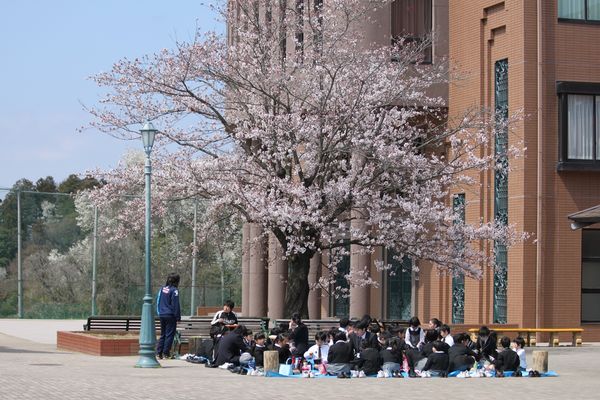 英宏小の桜の木が満開になりました。今日はお花見ランチタイムです。