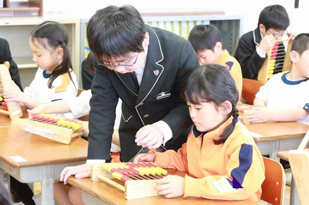 5年生は,1年生に高度なことを見せました。3.14の百玉そろばんの読み上げや,0.01の読み上げなどをして,真剣な5年生を1年生はとても静かに見つめていました。