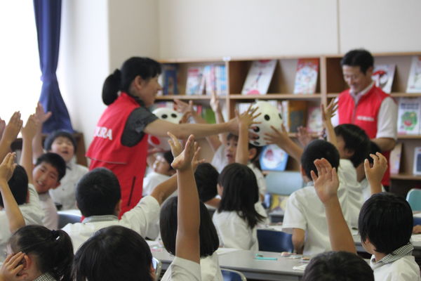 授業は楽しいゲームを通して進みます。「輸入体験ゲーム」に大盛り上がりの子どもたち。