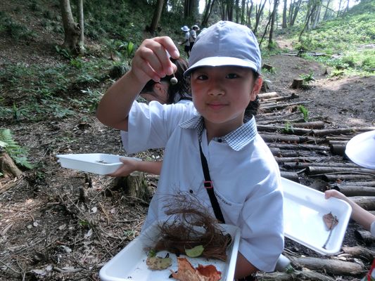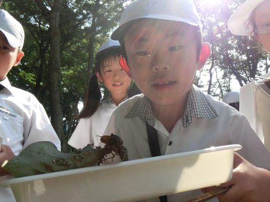 学校に隣接するビオトープ「英宏の泉」ではたかこ先生と一緒に自然観察。