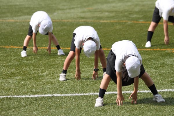 英宏小のサマースクールは朝体操で始まります。ラジオ体操の英語バージョンで心と体をリフレッシュします。
